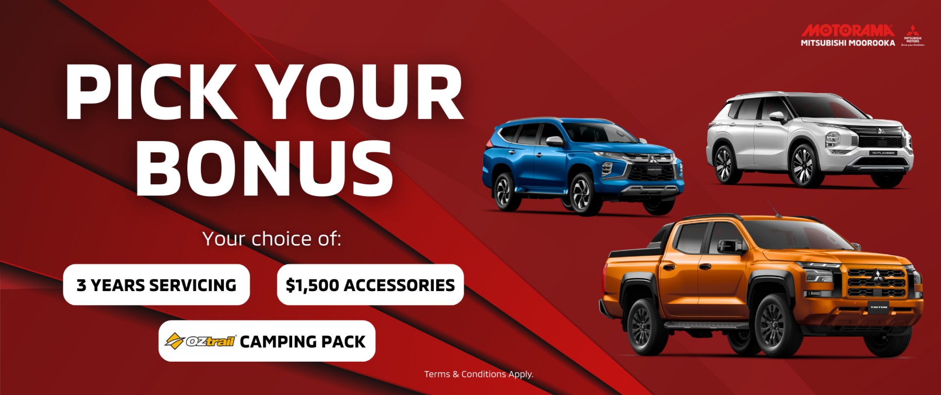 - The choice of bonus include; (a) $1,500 of Mitsubishi Genuine Accessories; (b) $2,500 Oztrail Camping Pack; (c) 3 Years free scheduled servicing (Valued between $1,065 and $1,510 dependent on the vehicle purchased) only valid at Motorama Mitsubishi.